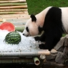 초복인 12일 오전 경기도 용인시 에버랜드 판다월드에서 암컷 판다 아이바오가 사육사들이 준비한 대나무 생일 케이크를 바라보고 있다. 에버…