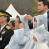 3일 충남 천안 소방학교에서 열린 ’소방의날’ 행사에 참석한 문재인 대통령이 갑자기 내린 비때문에 우의 모자를 쓰려하자 한 경호원이 도와주…