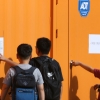 26일 오전 서울 은평구 은명초등학교에 설치된 가설교사 앞에서 학생들이 안내판을 보고 있다. 학교 측은 지난 6월 화재로 불에 탄 3,5학…