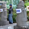 28일 오전 제주국제공항 입구에 세워진 마스크 낀 돌하르방을 관광객들이 바라보고 있다. 2020.4.28 연합뉴스