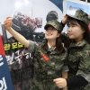 21일 오전 경기도 수원시 권선구 수원메쎄에서 열린 ‘2023 달고나 고졸채용박람회’에서 학생들이 해병대 부스에서 군복을 입어보고 있다.