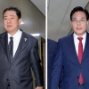 더불어민주당 김병기 원내대표(왼쪽)와 국민의힘 송언석 원내대표가 23일 서울 여의도 국회에서 정부조직법 개정안 등을 논의하기 위해 이동하…