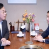 더불어민주당 한병도 원내대표와 국민의힘 송언석 원내대표가 30일 서울 영등포구청역 인근 식당에서 오찬 회동을 하며 악수하고 있다. 연합뉴…